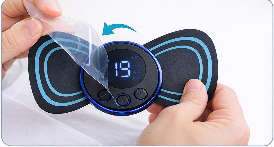 Limpia y seca la piel, retira el protector del gel adhesivo y pega el masajeador directamente sobre el cuello o la zona con tensión, presionando suavemente para que quede bien adherido.